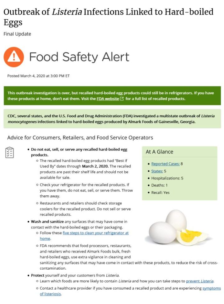 美国疾病管制预防中心警告说,李斯特菌可能引起的严重感染,呼吁商家和民众不要出售,食用或使用这些制造商来源的鸡蛋制食品。截至2019年12月共有5个州通报与李斯特菌相关的中毒案件包括:德州,南卡罗来纳州,缅因州,宾州和佛罗里达州,共有七件案例。其中四名患病住院,一人死亡。
