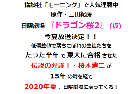 2005年播出的《龙樱》或许是不少中国观众的日剧启蒙作品之一,3月10日今天官方宣布续集《龙樱2》将于2020年夏季开播,传说的律师阿部宽再度进击学园!