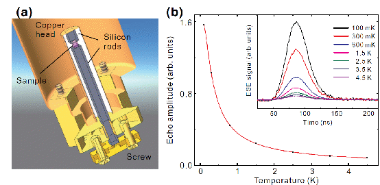 (a)深低温电子与核自旋双共振谱仪的样品局部图(b)自旋回波信号强度与工作温度的关系
