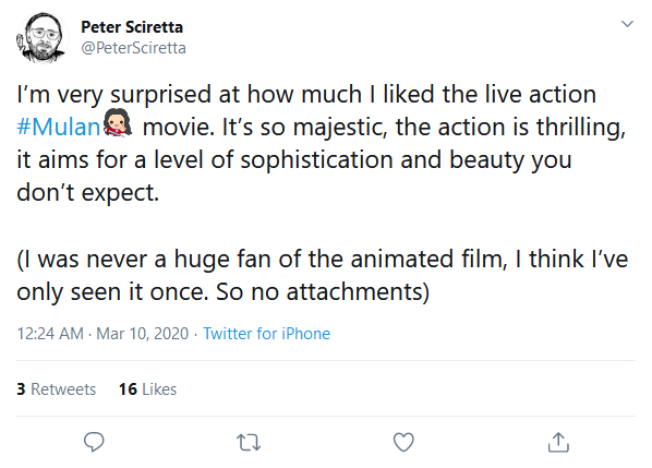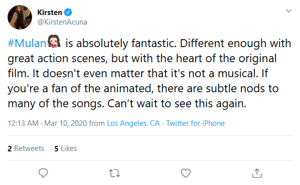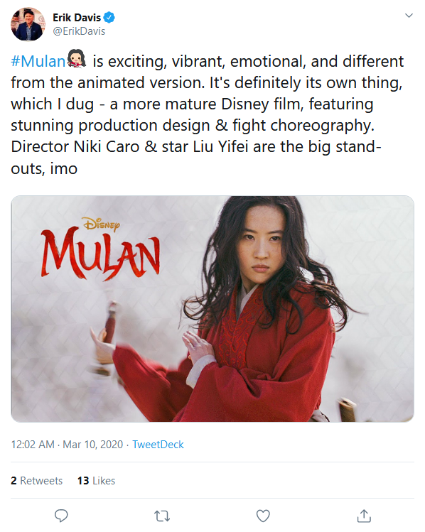 Fandango网站的Erik Davis:“《花木兰》令人振奋、充满活力、情感丰富,与动画版不同。这是一部更加成熟的迪士尼电影,配以令人目眩的制作和打斗。导演Niki Caro和主演刘亦菲是最大的亮点。”