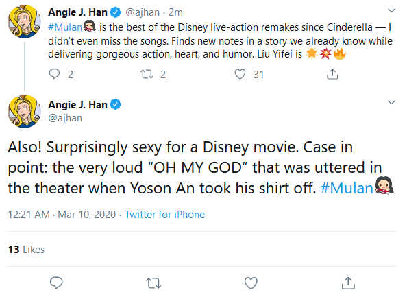 Mashable的Angie J.Han:“《花木兰》从我们熟知的故事中寻找新的闪光点,并将美妙的动作戏、情感和恰到好处的幽默传达给观众。刘亦菲太给力了。另外!对于一部迪士尼电影来说意外的性感。”
