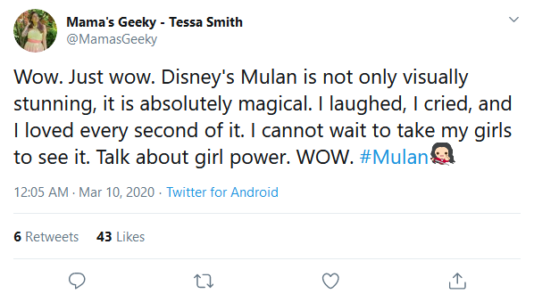 The Geekly Show的Tesa Smith:“我只能说——NB疯了。迪士尼《花木兰》不光令人目眩神迷,还充满了深层魅力。观影过程中我时而大笑时而落泪,但我喜欢《花木兰》的每一秒。”