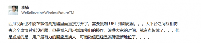 3月10日消息,李楠在知乎发表想法,表示西瓜视频不能在微信浏览器里面直接打开了,需要复制URL到浏览器。大平台之间互相伤害这个事情其实没问题,但是卷入用户增加我们的操作,浪费大家的时间,就有点智障了。但是尴尬的是,用户最有力的回应是换人,可惜微信已经是实际垄断地位了。