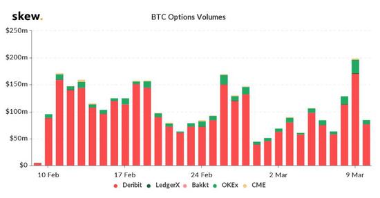 来自Skew的衍生产品市场研究人员还记录了Bakkt,CME,OKEx和LedgerX等交易所的相关交易情况。