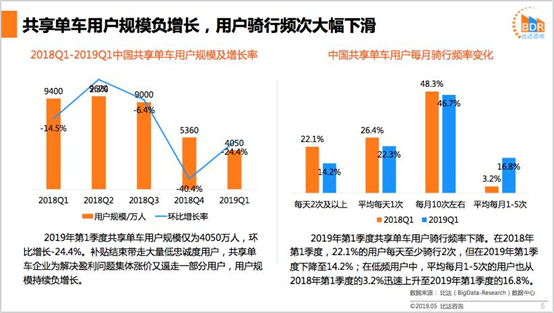 第三方研究机构比达发布的《2019年第1季度中国共享单车市场研究报告》显示,2018年起共享单车普遍开始涨价,用户流失明显,用户规模持续负增长。2019年第1季度共享单车用户规模仅为4050万人,降幅达24.4%。同时,因为涨价以及天气寒冷等原因,用户骑行频率大幅下降。