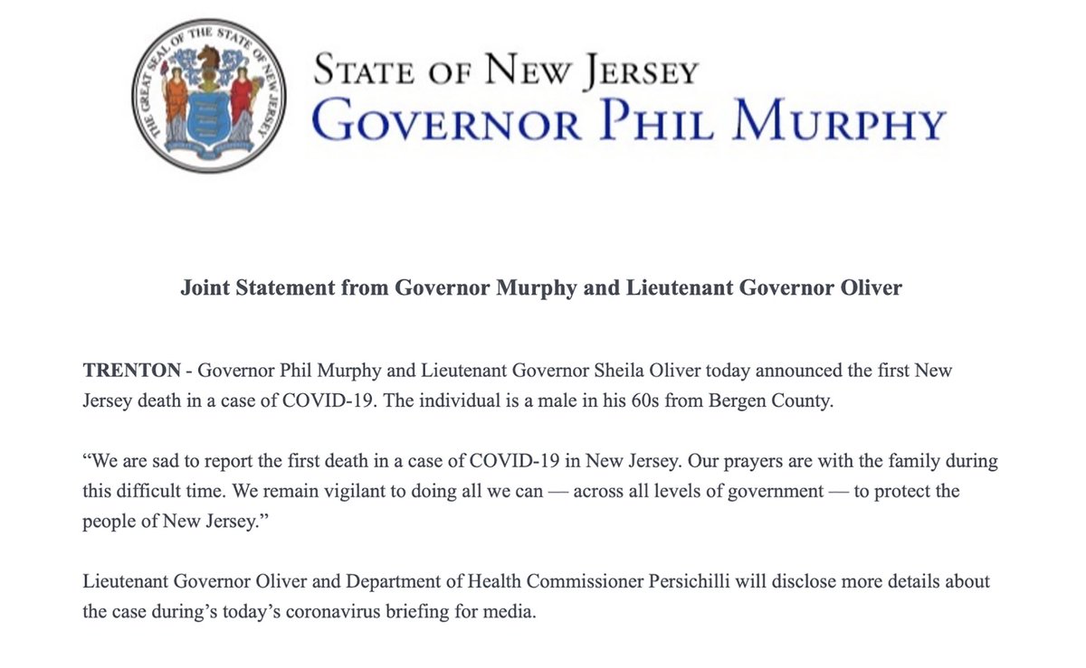 而在新泽西,美国新泽西州州长墨菲(Phil Murphy)在当天一则声明中称,一69岁男子因感染新冠病毒逝世。目前该名死者身份及详细信息未被明确,但卫生官员说其有肺气肿、高血压和糖尿病等潜在疾病。据了解,该名男子没有前往高风险国家的旅行,但在纽约工作。