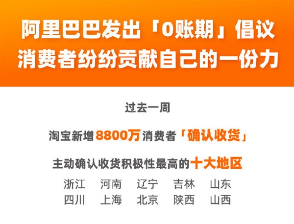 值得一提的是,消费者们也在默默助力商家缩短回款时间。过去一周,淘宝上就新增了8800万消费者“确认收货”,帮助商家提前回拢资金。