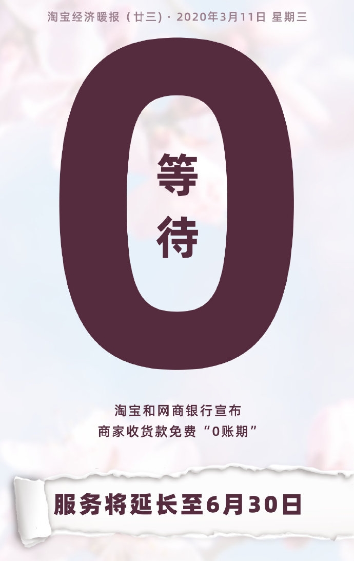 今天,淘宝联合网商银行宣布,为商家提供的“0账期免费回款服务”将延长至6月30日,预计总垫资规模将超过2000亿。这项服务原定3月31日结束。此前3月2日,网商银行和淘宝联合发起倡议,呼吁全社会缩短中小企业账期,不截流不拖欠,保护他们的资金链;网商银行将垫资500-1000亿,和淘宝一起,首先践行“0账期”。
