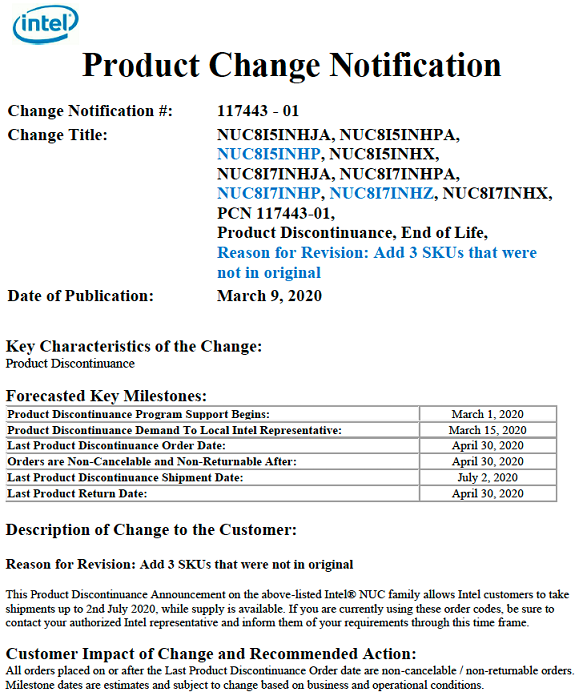根据本月发布的超紧凑外形(UCFF)系统的变更通知,英特尔计划终止大部分基于 Whiskey Lake 的八代 NUC 机型的销售。正如其它 EoL 过渡计划一样,英特尔向客户提供了一定的缓冲时间,NUC 8 系列的最终发货是在今年七月。