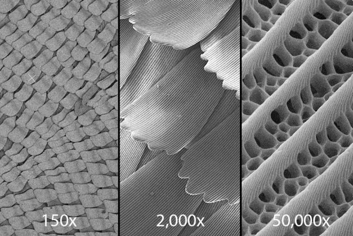 放大蝴蝶的翅膀可以看到鳞片的层次。至于超黑的外观,杜克大学将其描述为“由蝴蝶的翼鳞的3D结构产生的视觉错觉”。显微镜图像突出显示了这些纳米结构的细节,这些结构以一系列的脊状出现,中间有蜂窝状结构。研究人员发现, “与“正常”黑鳞相比,超黑鳞中的这些脊和柱更深、更厚”。