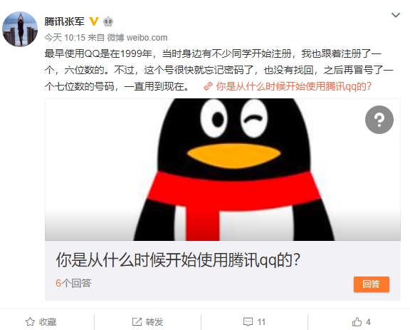 每个人的QQ号都是一面青春的镜子。你从什么时候开始用QQ的?今日,腾讯公关总监@腾讯张军 分享了自己使用QQ的经历。他表示,自己最早使用QQ是在1999年,当时身边有不少同学开始注册,也跟着注册了一个,六位数的。