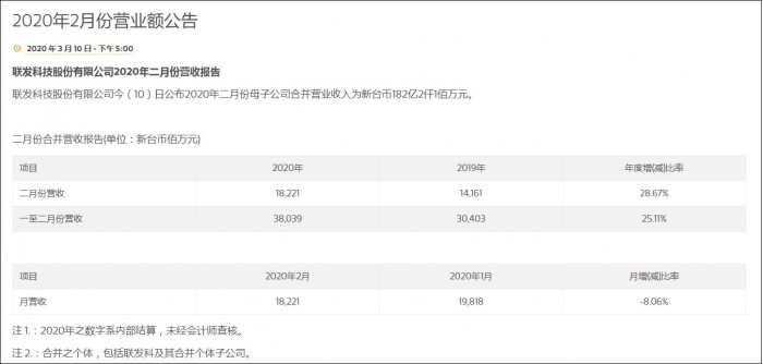 该公司1月营收198.18亿元新台币,环比减少10.28%。