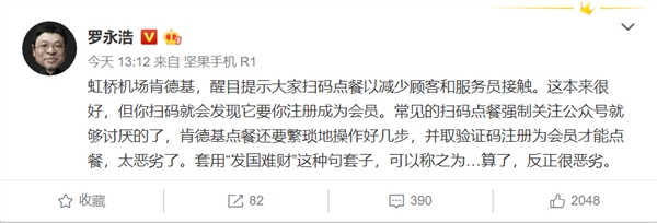 3月11日消息,锤子科技CEO罗永浩微博吐槽肯德基。罗永浩表示,虹桥机场肯德基醒目提示大家扫码点餐以减少顾客和服务员接触。这本来很好,但你扫码就会发现它要你注册成为会员。常见的扫码点餐强制关注公众号就够讨厌的了,肯德基点餐还要繁琐地操作好几步,并取验证码注册为会员才能点餐,太恶劣了。