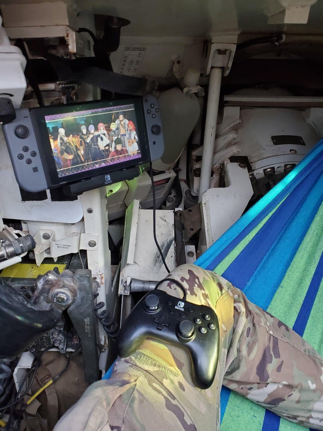 近日国外玩家Amarthanor在Reddit论坛中分享了一张特别照片,引发网友热议。因为这位玩家是坦克炮手,他在M1A2艾布拉姆斯主战坦克中,坐在吊床上用Switch玩游戏。他还在Switch上外接了手柄玩游戏,这样比较方便。