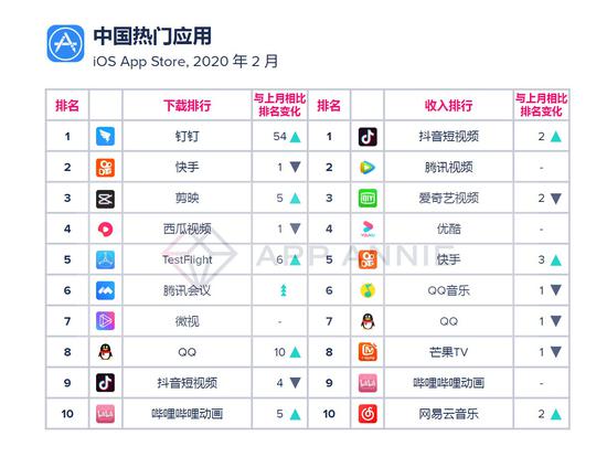 热门应用方面,在线办公App也因疫情而意外火爆。中国热门应用下载排行方面,阿里巴巴旗下智能移动办公平台钉钉App在2月获得了超过300%的环比增长,成为下载榜冠军,腾讯旗下的腾讯会议App也跃升至2月排行榜第6位,环比增长超过10倍。