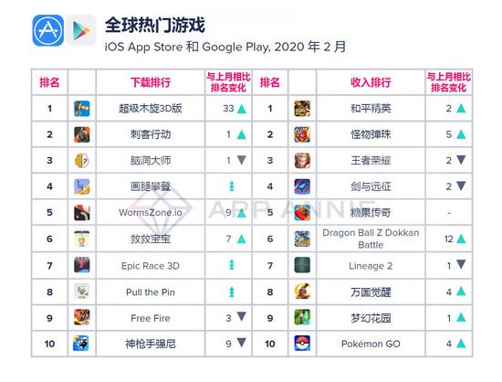 3月11日下午消息,近日,移动数据和分析公司App Annie发布了2020年2月AppAnnie月度指数排行榜。热门游戏方面,腾讯的《和平精英》在全球热门游戏和中国热门游戏两个榜单的收入排名中均上升至首位。《王者荣耀》于全球热门游戏收入排行下滑至第三,在中国热门游戏收入排行下降一位至第二。