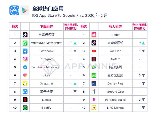 全球热门应用榜单中,字节跳动旗下TikTok是2月下载排行冠军及收入排行亚军。