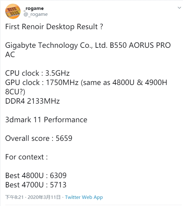 今天,硬件曝料专家@_rogame意外发现了第一颗7nm Zen桌面级锐龙APU的踪影,搭配一块技嘉的B550 Aorus Pro AC主板,具体型号不明,只知道CPU主频为3.5GHz,GPU频率为1750MHz,搭配DDR4-2133内存。