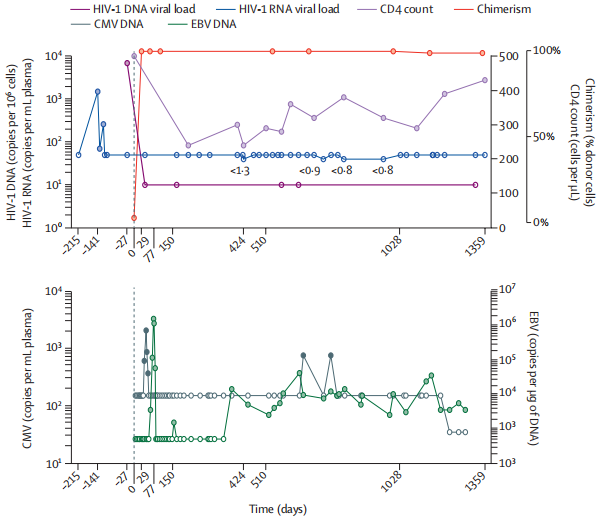 移植后,研究人员在患者外周血中分离的 CD4 T 细胞不表达 CCR5,并且仅在体外对 CXCR4 嗜性病毒敏感,同时 HIV-1Gag 特异性 CD4 和 CD8 T 细胞应答丧失,而可检测到细胞特异性应答。