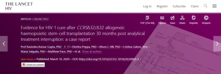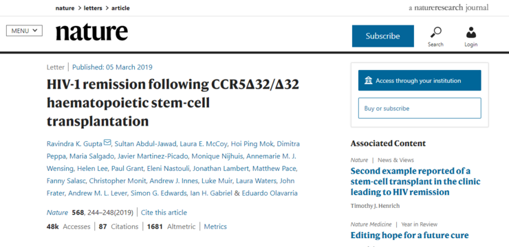 当地时间 2019 年 3 月 5 日,《自然》杂志刊登了 Ravindra K. Gupta 团队对名为 HIV-1 remission following CCR5Δ32/Δ32 haematopoietic stem-cell transplantation(CCR5Δ32/Δ32 造血干细胞移植后 HIV-1 的缓解)的论文。