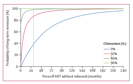如下图所示,研究团队根据数学模型得出了结论——该患者在总 HIV 靶细胞中供体嵌合率为 80% 的情况下,终生缓解(治愈)率为 98%;在供体嵌合率为 90% 的情况下,终生缓解率大于 99%。