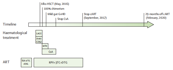 当地时间 2020 年 3 月 10 日,《柳叶刀-艾滋病》刊登了名为 Evidence for HIV-1 cure after CCR5Δ32/Δ32 allogeneic haemopoietic stem-cell transplantation 30 months post analytical treatment interruption: a case report(CCR5 Δ 32/Δ 32 异基因造血干细胞移植治疗中断 30 个月后 HIV-1 治愈的证据:1 例病例报告)的研究成果。