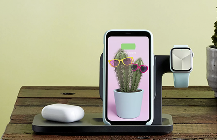 与其他AirPower替代产品一样,三合一充电座有两个无线充电区,一个用于电话的站立式充电垫和一个用于耳机的平板充电垫。此外,这款设备还配备了一个集成的苹果手表充电器,允许用户同时为所有三台苹果日常设备充电。