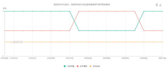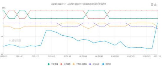 以七麦数据的统计为例,从春节(1月24日)到3月11日,iOS畅销榜的前三一直在腾讯系的《王者荣耀》《和平精英》、莉莉丝游戏的《剑与远征》、阿里的《三国志·战略版》四者之间角逐,当然,偶尔也有《阴阳师》这样的产品杀入头部梯队。