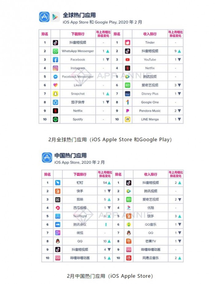 热门应用方面,在线办公App也因疫情而意外火爆。中国热门应用下载排行方面,阿里巴巴旗下智能移动办公平台钉钉App在2月获得了超过300%的环比增长,成为下载榜冠军,腾讯旗下的腾讯会议App也跃升至2月排行榜第6位,环比增长超过10倍。
