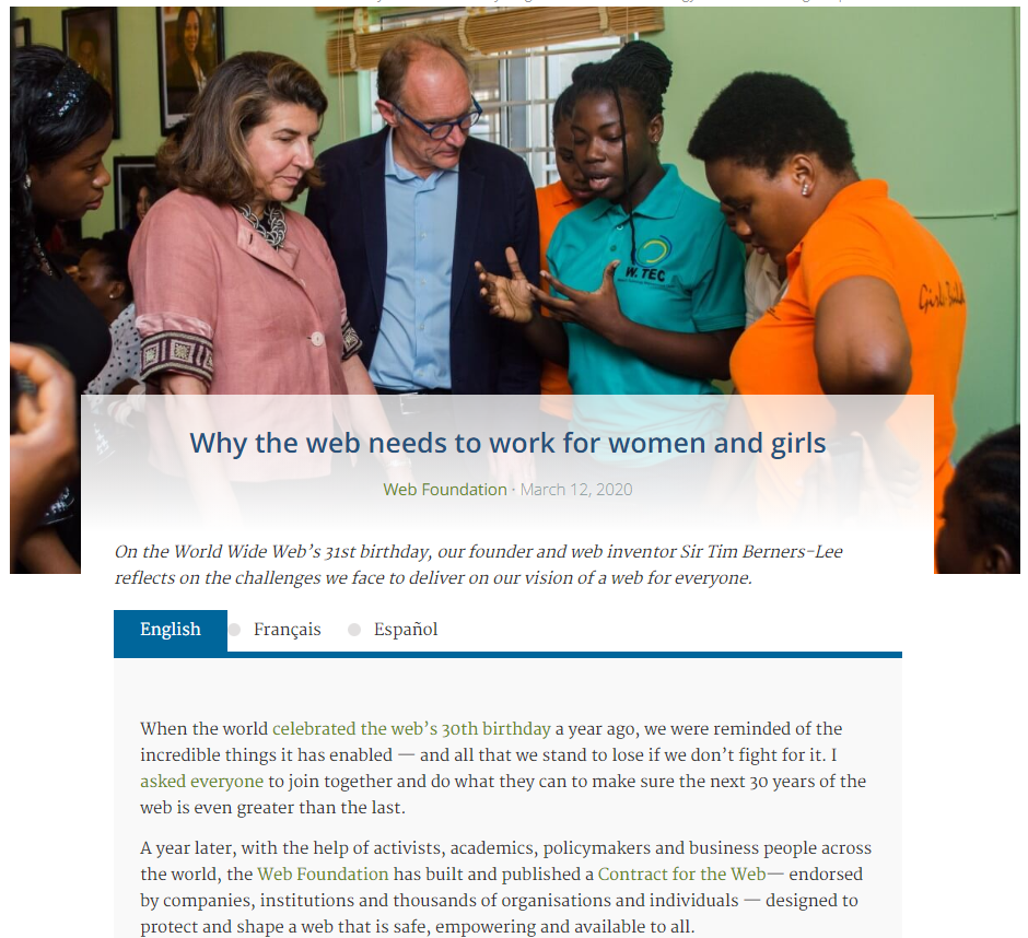 2020年对于女性权利而言是极为重要的一年,因为它距北京世界妇女大会已经过去25年了,距联合国实现性别平等的2030年目标还有10年之遥。万维网基金会政策主任Emily Sharpe说,这就是Tim Berners-Lee选择这一时刻来敦促政府和科技公司与女性权利组织更深入地接触的原因。