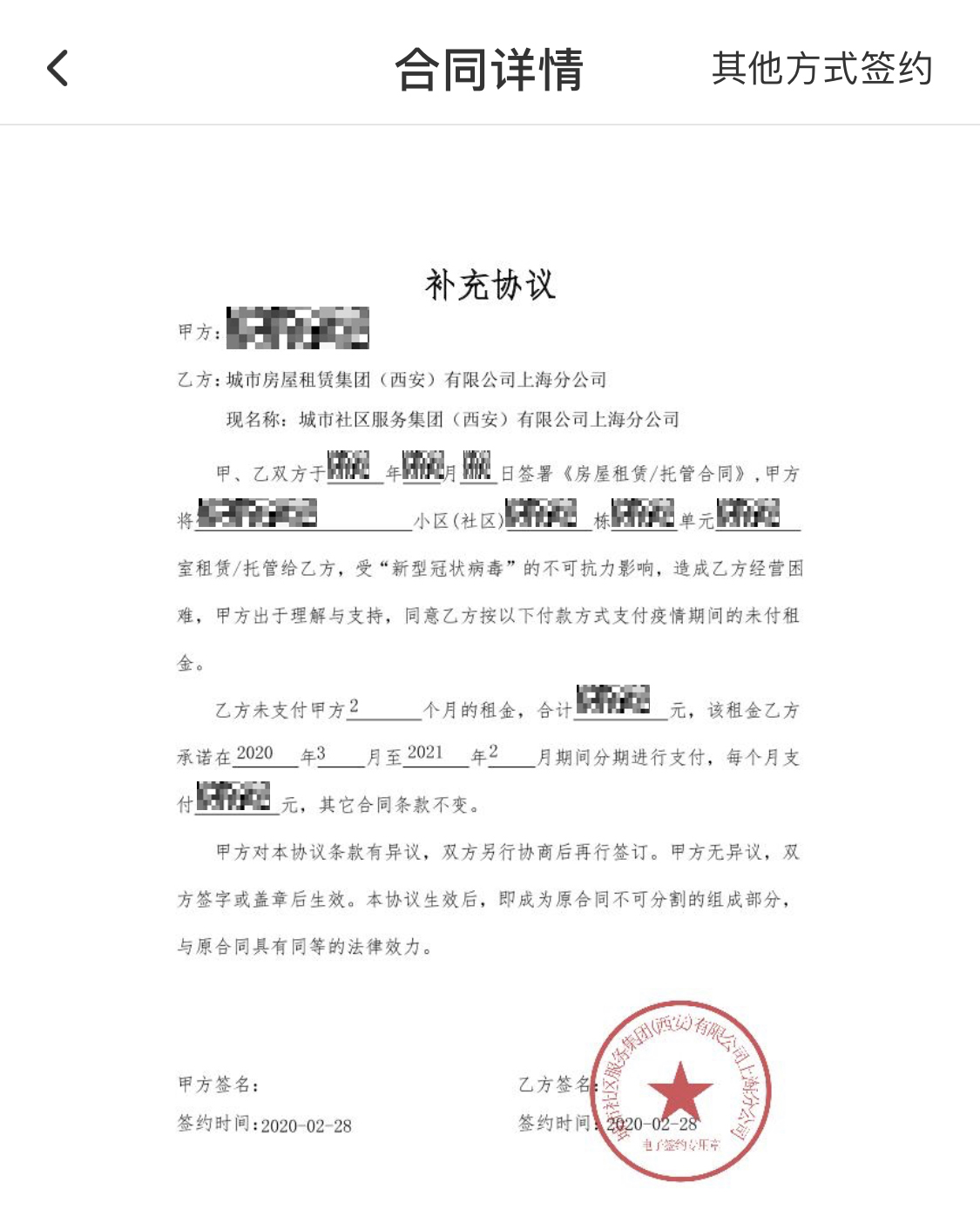 陈蕾女士表示,最开始三彩家是以春节放假、延迟复工为理由要暂缓支付房租,到2月25日,房租又没有到账,就直接变成了拖欠。后来业主陆续开始要求支付房租,但是没想到三彩家竟然要求他们签署一份补充协议。