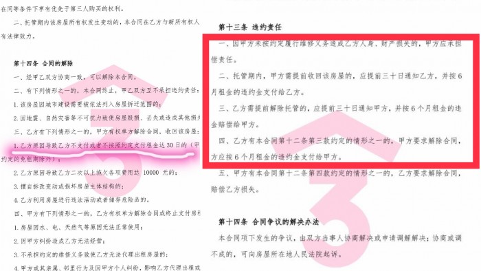 但根据陈蕾女士出示的委托合同显示,如果出现不可抗力因素如拆迁、地震与自然灾害等,可以解除合同。并不包含疫情所致的因素。此外,合同还规定,如果是乙方(三彩家)原因导致乙方不支付或者不按照约定支付租金达30日的,甲方(业主)可以收回房屋。如果是乙方要求提前解除合同,需要支付6个月的租金为甲方作为违约金。