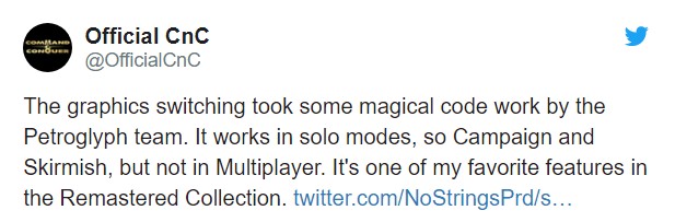 答:画质切换需要岩石壁画团队做一些神奇的工作,但是他们完成了。目前画质切换仅限于单人模式,比如战役和遭遇战,多人模式不能使用。 这是我在《命令与征服:重制版》中最喜欢的功能之一。