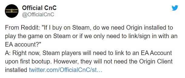答:有人在Reddit上问过了“如果我在Steam上购买《命令与征服:重制版》,是否需要安装Origin来玩Steam上的游戏,或者我们只需要登陆EA账号就行? ”我们的答案是:玩家需要在第一次启动时链接到EA帐号。 但是,他们不需要安装Origin客户端。