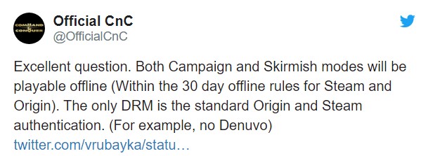 答:问的好。遭遇战和战役模式可以离线游玩(但是会受到Steam/Origin 30天离线规则的影响),这次《命令与征服:重制版》只会包含标准的Steam/Origin验证,不会使用D加密。
