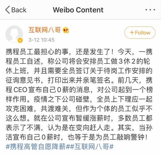 3月12日午间消息,近日有传闻称,携程已下发通知,安排员工上三休二轮休上班,并且要签订待岗工作协议。携程官方暂未置评。网络上流传的待岗工作安排征询意见书显示,安排工作的时间按原工资标准计薪,未安排工作的时间不计薪;待疫情好转,恢复原工时制度及工资标准。