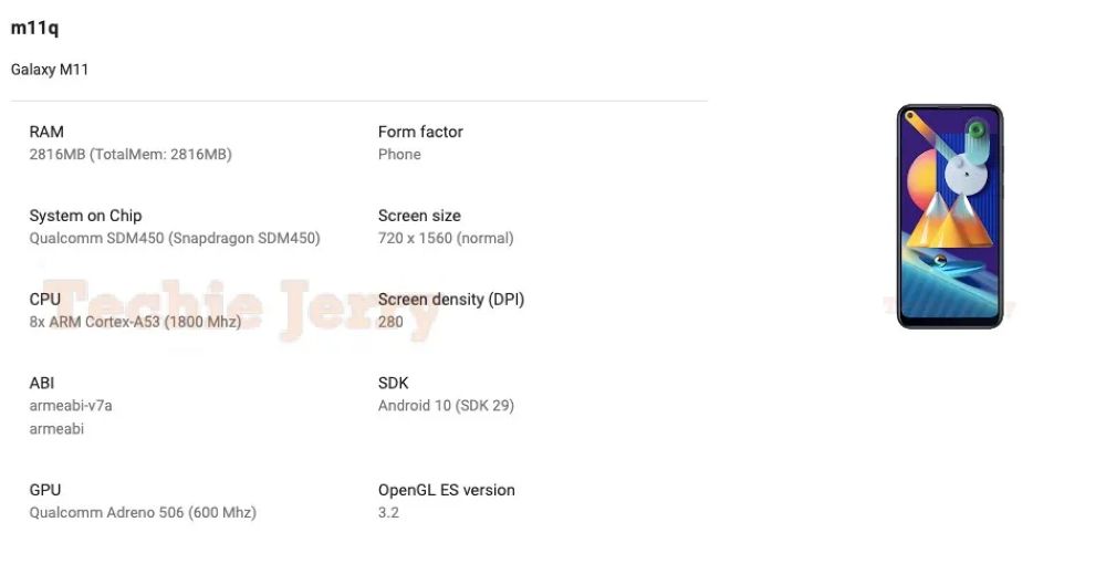 根据清单显示三星Galaxy M11将采用720 x 1,560p分辨率的Infinity-O显示屏,右上角有个自拍摄像头开孔。机身内部可能和Galaxy A20s一样装备高通骁龙450处理器,搭载基于Android 10的OneUI 2.0外观。