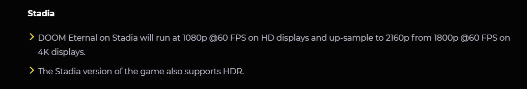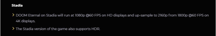 这份承诺在去年赢得了满堂喝彩,然而事实证明id Software和谷歌Stadia钻了空子。在B社放出的《毁灭战士:永恒》发售详情页面中明确提到了,Stadia平台的《毁灭战士:永恒》将在HD显示器上以1080P/60帧运行,在4K显示器上借助采样技术从1800P/60帧拉升至4K运行。换句话说,这并不是所谓的“原生4K”。