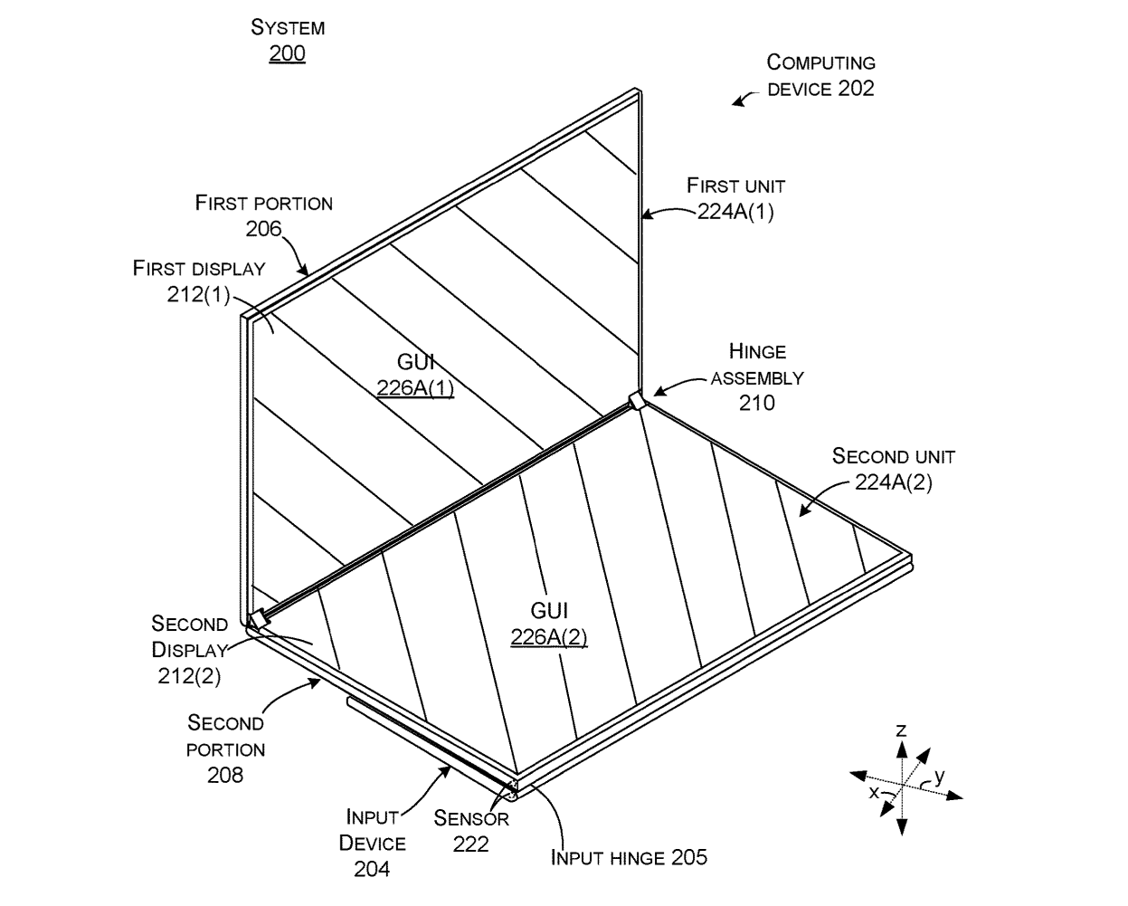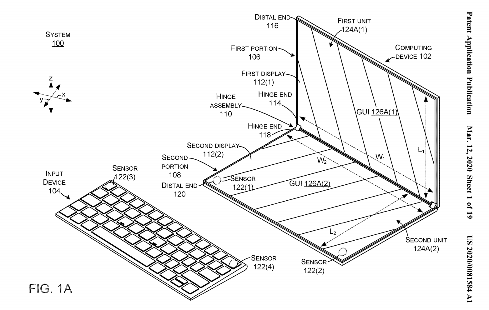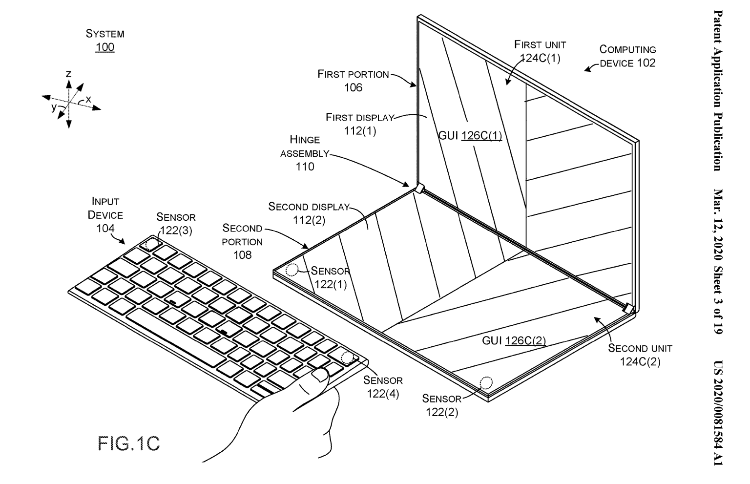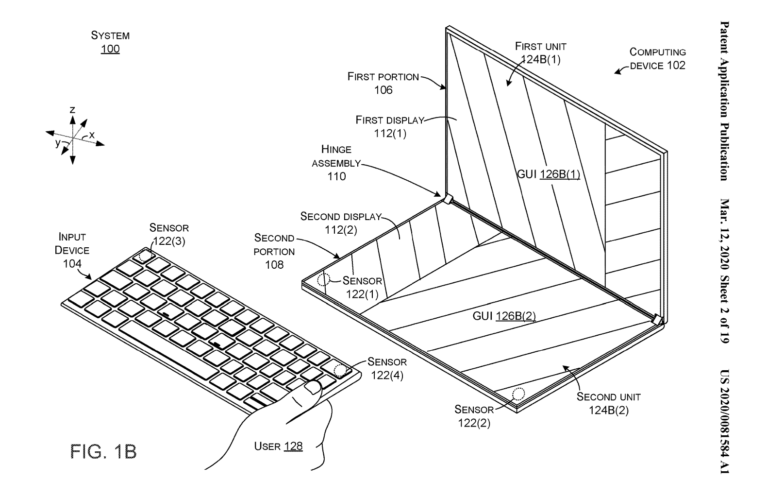 今天外媒Windows Lastest发现了一款Surface Neo的技术专利。在专利概述中,微软计划让两块屏幕执行不同的功能。例如一块屏幕用于显示GUI,而另一块屏幕则显示输入区域。如果屏幕的一部分被用户遮挡,那么Surface Neo就会根据遮挡物重新计算屏幕的可显示区域,重新调整应用的显示位置。