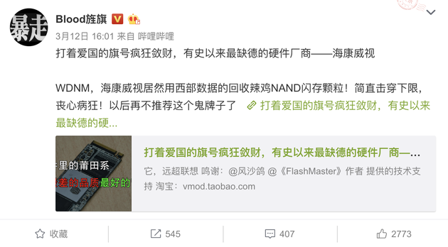 知名数码博主 @Blood旌旗 在微博中爆料,固态硬盘厂商海康威视使用西部数据回收的NAND闪存颗粒。这已经不是海康威视第一次出现这样的问题,在黑猫投诉上发现,有用户投诉海康威视c2000固态就涉嫌虚假宣传,宣传颗粒为东芝颗粒,实际颗粒为镁光颗粒。