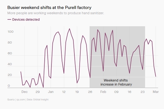 普瑞来(Purell)洗手液生产商GOJO正在给生产线加派人手。透过匿名数据,Orbital Insight的平台可分析出其工厂的特定区域有多少台移动设备。这让他们有了一个指标来估量像普瑞来工厂这样的地方的工人人数。数据显示,普瑞来工厂似乎在2月份增加了周末的班次(见下图)。