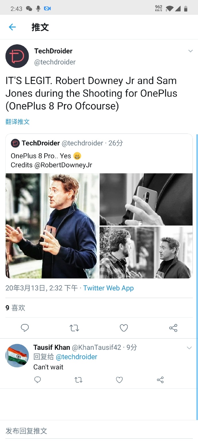 大家都知道,国际著名影星钢铁侠的扮演者小罗伯特唐尼是一加手机的代言人,在很多一加发布会的宣传片里他都有出境,现在的时间临近一加8系列的发布会,所以从他身上也能得到一些关于一加新机的消息。