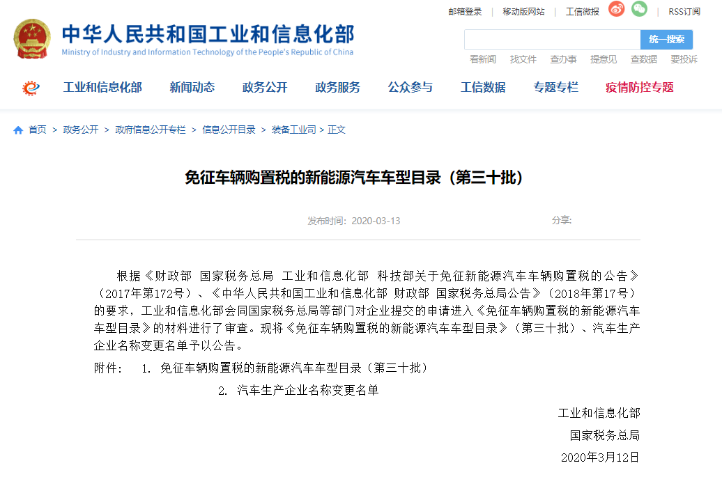 根据《财政部 国家税务总局 工业和信息化部 科技部关于免征新能源汽车车辆购置税的公告》(2017年第172号)、《中华人民共和国工业和信息化部 财政部 国家税务总局公告》(2018年第17号)的要求,工业和信息化部会同国家税务总局等部门对企业提交的申请进入《免征车辆购置税的新能源汽车车型目录》的材料进行了审查。现将《免征车辆购置税的新能源汽车车型目录》(第三十批)、汽车生产企业名称变更名单予以公告。