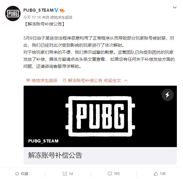 《绝地求生》官方还表示:我们PUBG团队的优先级最高的工作是为玩家们提供安全、公正的绿色游戏环境,在时刻变化的激烈的战斗之中,我们将会持续与未认证程序进行对抗。