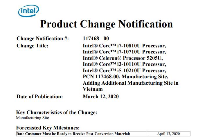 Intel公司日前宣布,多款十代酷睿(Comet Lake家族)将增加新的产地——越南封装厂,它们与中国的封装厂是同样的质量,只是工厂不同。影响的产品主要是酷睿i7-10810U/10710U/、赛扬5205U、酷睿i3-10110U及酷睿i5-10210U,这些都是去年Q3季度发布的十代酷睿处理器,不过是14nm Comet Lake彗星湖家族的。
