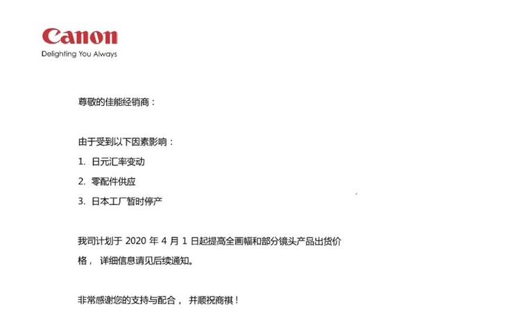 今日网上流出一份佳能发放给经销商的通知,显示下月起佳能全画幅、部分镜头的价格将会上调。通知称,由于日元汇率变动、零配件供应、日本工厂暂时停产等因素影响,佳能计划于2020年4月1日起,提高全画幅和部分镜头产品的出货价格,详细信息将在后续通知。