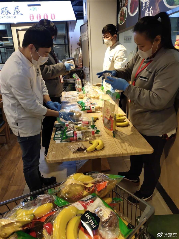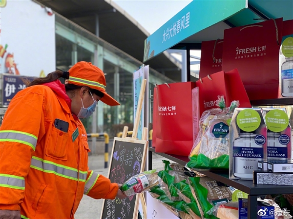 3月11日,京东还在北京大兴大悦春风里附近推出了“无人值守爱心站”,每一份礼包都经过独立包装,可免费领取,包括酒精湿巾、一次性PVC手套等安全防疫物品,柑橘、苹果、进口香蕉等多种新鲜水果,还有坚果、碱水软面包、全麦餐包、矿泉水等食品,为外卖小哥、快递小哥、的士司机、城市公共服务人员、社区居委会、物业工作人员等一线服务工作者补充能量。