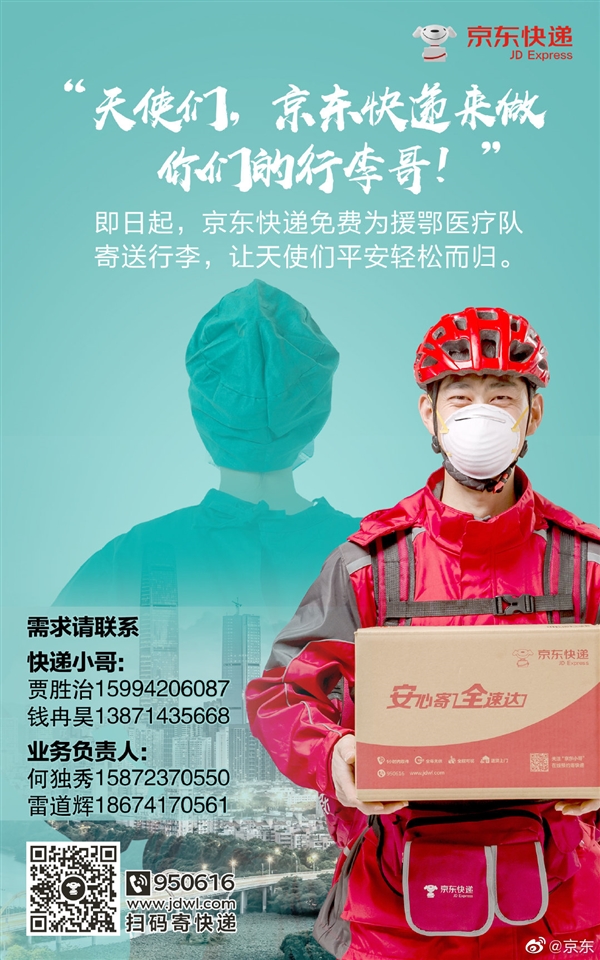 同时,京东公布了快递小哥、业务负责人的联系方式,有需求的医疗队可以直接联系: