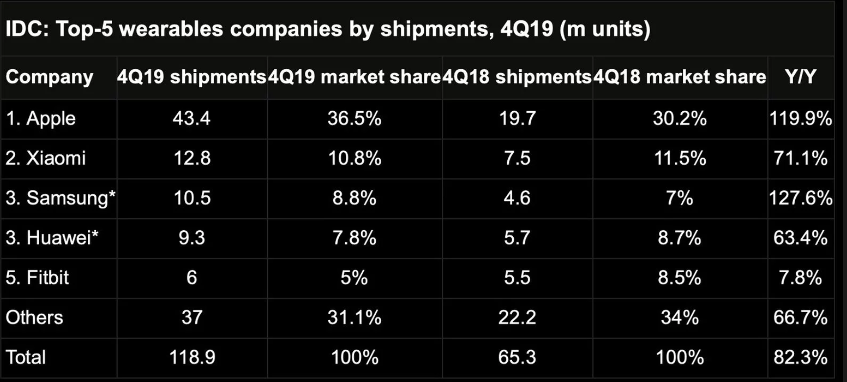 根据IDC的数据,小米在去年第四季度销量排在第二位,出货量为1280万个(其中940万为腕带),市场份额为10.8%。三星Galaxy Active和Active 2智能手表的出货量使该公司排名第三,出货量为1050万换个,市场份额为8.8%。
