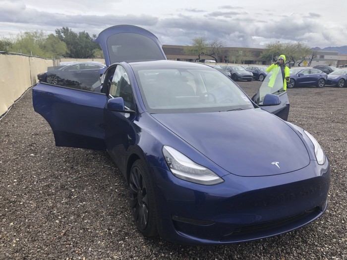 现在,Reddit用户“u/eweaver1983”在亚利桑那州的斯科茨代尔发现了一辆正在等待交付的Tesla Model Y。他拍摄的照片揭示了有关该汽车的新细节,并确定了量产车的最终规格。Tesla Model Y比Tesla Model 3大约10%,阻力系数为0.23Cd,并且具有约75%的相同组件。它具有全景天窗和可选的7座布局。Tesla Model Y有标准型号(续航里程315英里,售价52990美元),双电机型号(续航里程315英里,60990美元)两个版本。